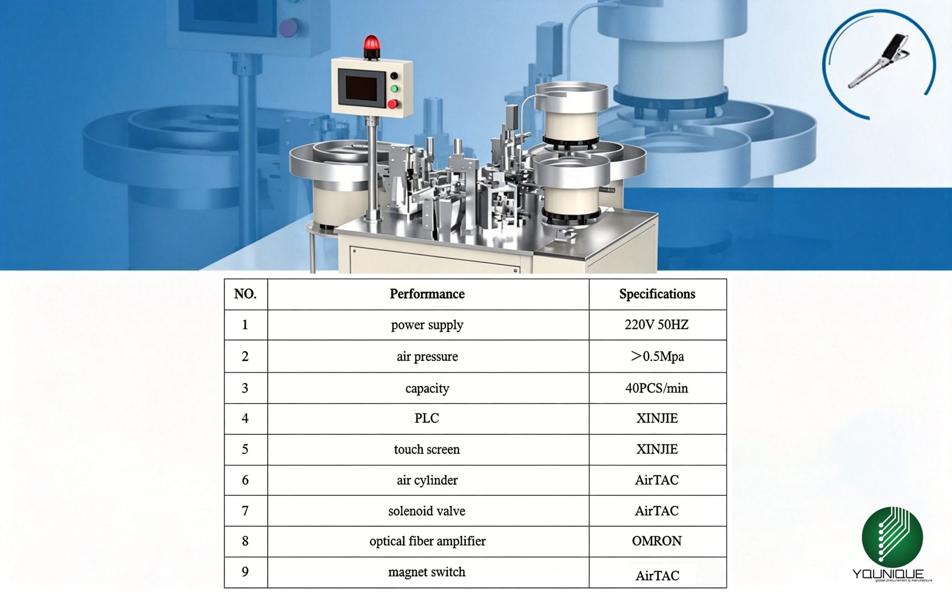 Automatic vibrating bowl / Step-lift feeder / Manual feeding (Optional based on custom plan) |