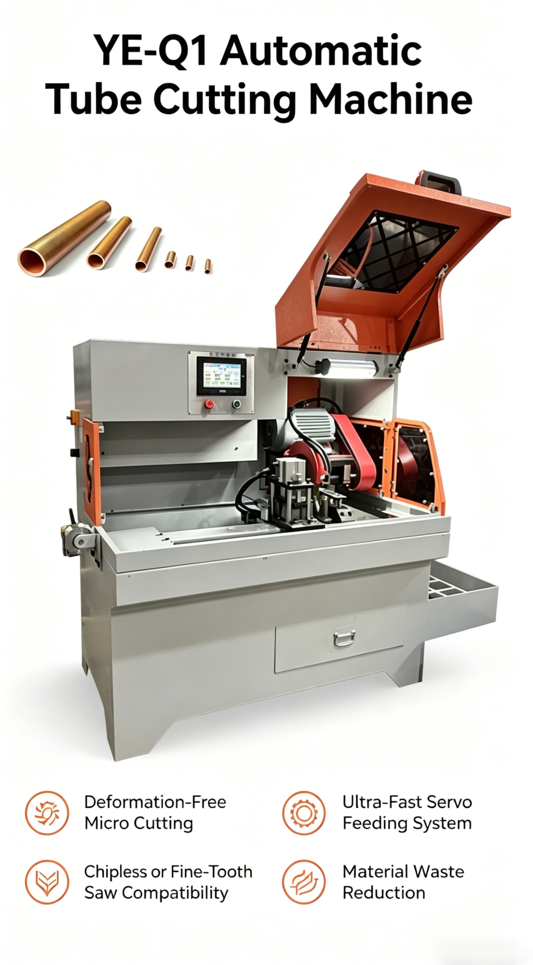 The YE-Q1 Automatic Capillary Tube Cutting Machine is a highly specialized automation system engineered explicitly for the precision processing of micro-tubing, tiny copper pipes, and capillary tubes. When cutting tubes with extremely small external and internal diameters, traditional saw blades inevitably crush the tube or leave metal chips that block the fluid pathway. The YE-Q1 completely eliminates these risks by utilizing an advanced chipless cutting mechanism.
