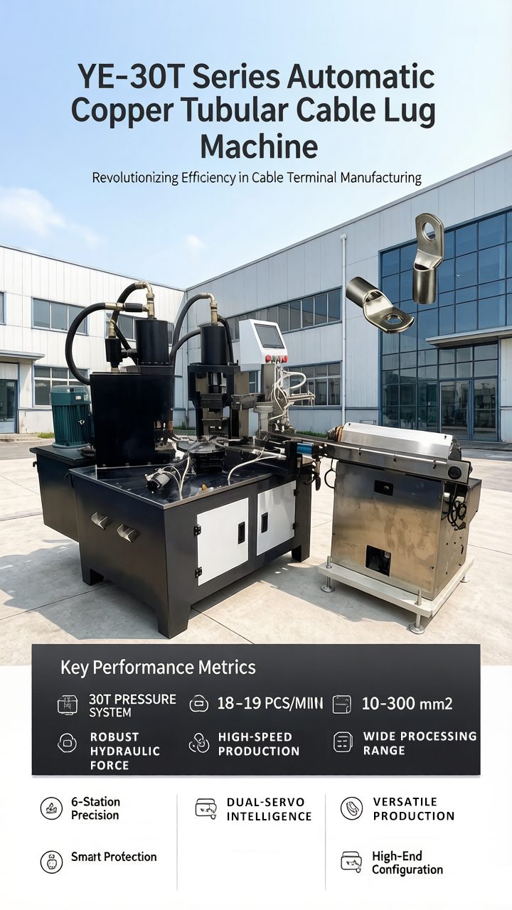 The Automatic Cable Lug Machine is a fully integrated manufacturing system designed for the high-speed production of copper tubular cable lugs. This advanced equipment automates the entire process—from raw tube feeding and precision cutting to flattening, punching, and final product discharge. Engineered for industrial-scale manufacturing, it ensures consistent quality and exceptional precision for electrical connectivity components.